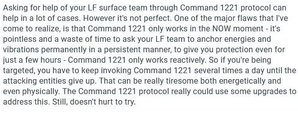 Τώρα είναι μια καλή στιγμή να αρχίσετε να συνδέεστε ξανά με τις Δυνάμεις του Φωτός. Μπορείτε να χρησιμοποιήσετε το Command 1221 (Εντολή 1221) για να συνδεθείτε με τη Φωτεινή ομάδα σας και εδώ είναι μερικά χρήσιμα σχόλια από τους αναγνώστες αυτού του ιστολογίου.